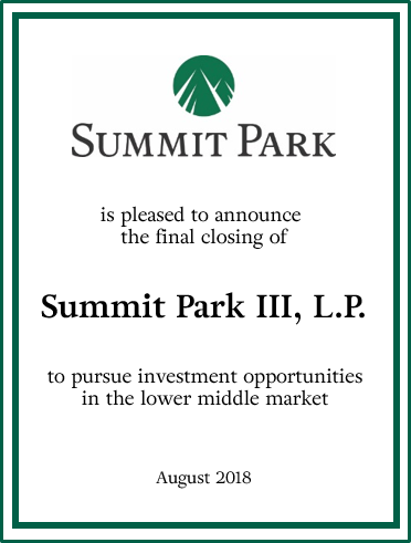Bob Calton continued, “We are grateful to our existing investors for their continued support and confidence in our Firm, and we are excited to partner with our new investors. Summit Park remains committed to being the partner of choice to entrepreneurs and management teams in the lower middle market, and we look forward to continuing our strategy to drive attractive returns for our investors.”