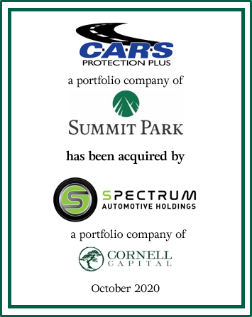 Summit Park, a Charlotte-based private investment firm, is pleased to announce the sale of its portfolio company C.A.R.S. Protection Plus (“CARS” or the “Company”) to Spectrum Automotive, a portfolio company of Cornell Capital. Terms of the transaction were not disclosed.