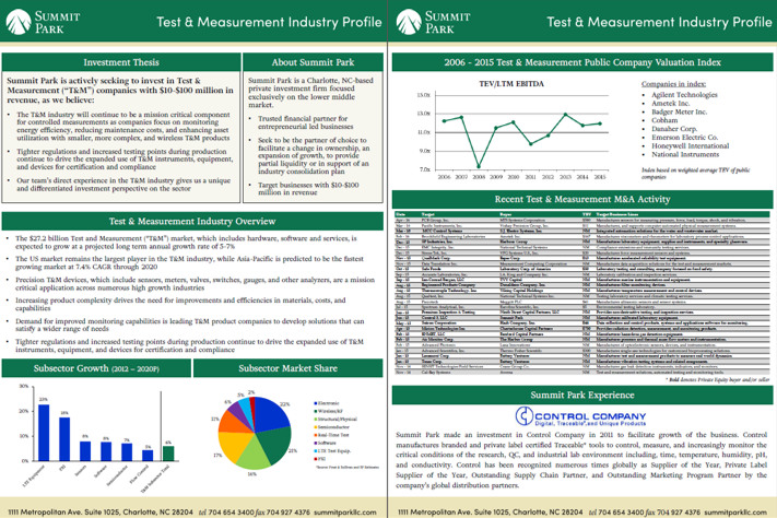 Summit Park is a Charlotte, NC based private equity firm that invests in companies with $10 to $100 million in revenues. We believe our team’s direct experience in the test and measurement industry gives us a unique and differentiated investment perspective in the sector. We strive to be the partner of choice for owners and management teams who share our mission of building companies of extraordinary values. To learn more about us please visit www.summitparkllc.com.
